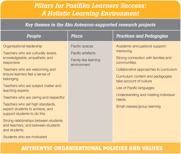These contributions form three pillars, which educational organisations are encouraged to incorporate within their policies, values and specific targets for Pacific achievement: